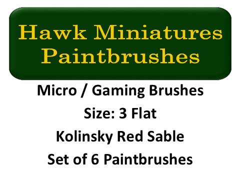 Micro/Gaming Paintbrushes Flat Size 3 (Set of 6)Set of 6 Kolinsky Sable hair paint brushes. The set contains 6 size 3 flat Micro or Gaming paintbrushes, with ergonomic polished walnut handles. Suitable for Oils, acrylics, and enamels, specially designed for modellers by modellers.Manufacturer: Hawk Miniature Paintbrushes Availability: 50 in stockSKU: HM-MG-Flat-S3 £22.95 Qty: Add to cart Custom wishlist OKAdd to wishlistEmail a friendMicro/Gaming Paintbrushes Flat Size 3 (Set of 6) The set of flat Kolinsky sable paintbrushes consists of 6 size-3 round Micro or Gaming paintbrushes with ergonomic, polished walnut handles.The set comes mounted on a stiff card backing with protective covers for the hairs and is suitable for Oils, acrylics, and enamels, specially designed for modellers by modellersProduct tags Paintbrushes (50)