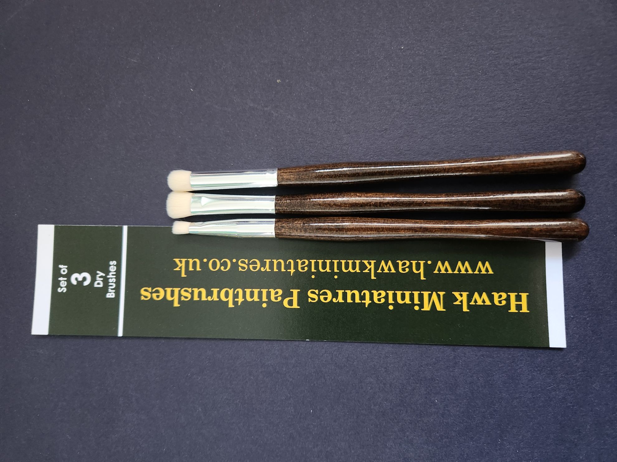 Set of 3 Synthetic dry brushes. The set contains the following shaped dry brushes: Flat Oval, Round Oval, and a Deerfoot. Suitable for Oils, Acrylics and Enamels, specially designed for modellers by modellers